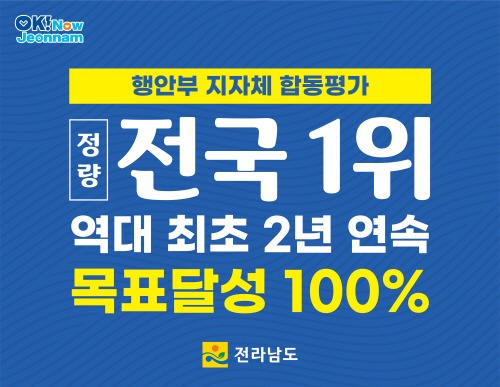 전라남도는 행정안전부의 2025년(2024년 실적) 지자체 합동평가 결과 정량지표에서 2년 연속 100%로 1위를 달성했다고 밝혔다.