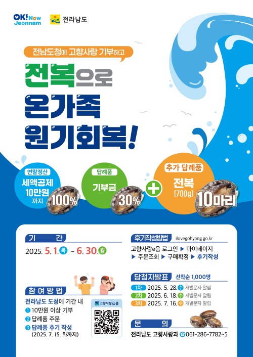 전라남도가 가정의 달을 맞아 6월 30일까지 두 달간 고향사랑기부제 답례품 후기를 작성하면 전남산 전복을 추가로 제공하는 이벤트를 한다.