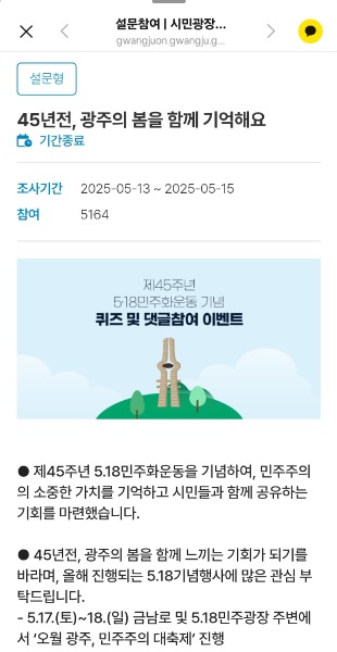 - 광주시, 시민소통 플랫폼 ‘퀴즈·댓글 이벤트’로 5·18 관심 확산