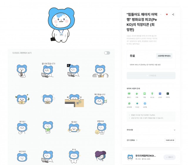 ‘힘들어도 해야지 어떡행-평화요정 피코(PeKO)의 직장티콘(희망편)’이란 이름의 새 이모티콘은 ‘무한 긍정과 열정의 직장인 피코’가 콘셉트다. 직장 생활과 일상에서 흔히 마주치는 상황과 감정을 위트 있게 표현해 직장인뿐 아니라 다양한 이용자가 활용할 수 있다.