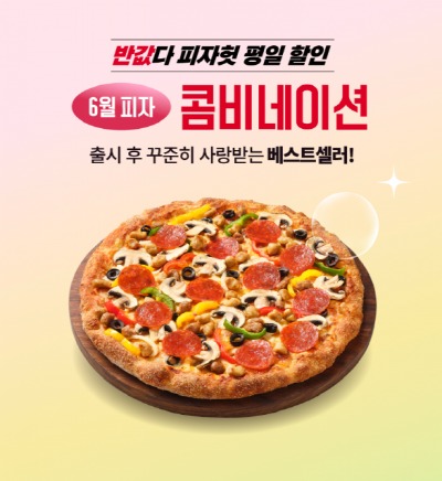 6월 ‘반값다 피자헛’ 프로모션은 클래식한 매력으로 오랜기간 사랑받고 있는 피자헛의 스테디셀러 ‘콤비네이션 피자’를 6월 평일 반값 혜택 대상으로 채택했다. ‘콤비네이션 피자’는 다양한 고기 토핑과 신선한 야채가 조화롭게 어우러져, 다양한 소비자 취향을 만족시킬 수 있을 것으로 기대된다.