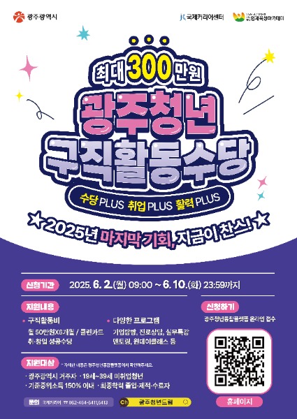 광주광역시(시장 강기정)는 ‘광주 청년구직활동수당 지원사업’에 참여할 3차 지원자 300명을 10일까지 모집한다.