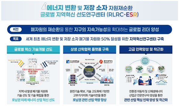 조선대학교는 조홍현 교수를 중심으로 지역혁신 선도연구센터를 구축하고, 에너지 변환 및 저장 소자에서 발생하는 폐기물의 자원화 50% 달성을 목표로 ▲에너지 변환·저장 폐소자 자원화 기술 개발 ▲폐소자 재사용 진단 및 재활용 기술 개발 ▲처리공정 소비에너지 활용 고도화 기술 개발 등 3개 연구그룹으로 기술 개발을 수행한다.