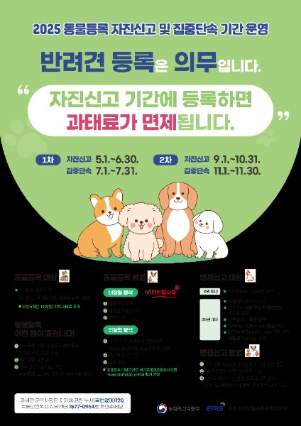 동물등록제도 활성화를 위한 ‘자진신고 및 집중단속 기간’은 올해 2차례 운영된다. 오는 9월부터 10월 말까지 자진신고 기간이 운영되고, 11월 한 달간 집중단속이 실시된다.
