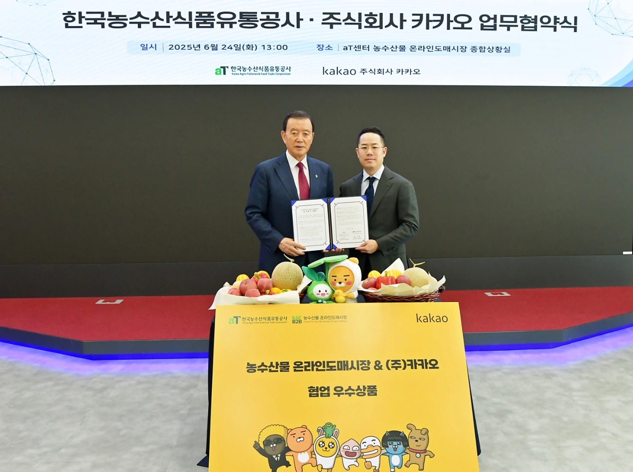 aT가 운영하는 농수산물 온라인도매시장은 농수산물 도매 거래의 디지털화를 목표로 개설됐으며, 일 평균 30억 원 이상이 거래되는 등 빠르게 성장 중이다. 카카오는 해당 시장에서 선별된 농수산물 상품을 ‘톡딜’, ‘선물하기’ 등 자사 커머스 서비스를 통해 소비자에게 소개할 계획이다.