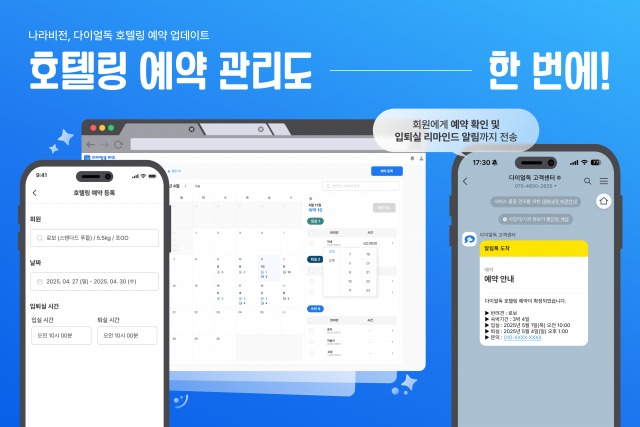 나라비전이 6월 30일 애견유치원 전용 고객관리 서비스 ‘다이얼독’에 호텔링 예약 기능을 새롭게 추가했다. 이제 유치원 예약, 알림장에 더해 호텔링 예약까지 한 플랫폼에서 통합 관리할 수 있다.