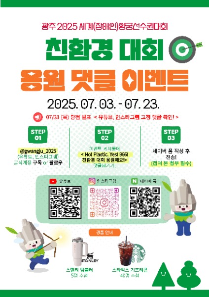이번 이벤트는 대회 공식 사회관계망(SNS) 계정(유튜브 및 인스타그램 @gwangju_2025)을 통해 ‘친환경 대회 응원 댓글 달기’로 진행된다. 참여 방법은 대회 공식 계정을 구독(또는 팔로우)하고, 이벤트 게시물에 응원 댓글을 작성한 후 네이버 폼에 제출하면 된다. 이벤트 참여자 중 추첨을 통해 텀블러와 커피쿠폰을 증정한다.