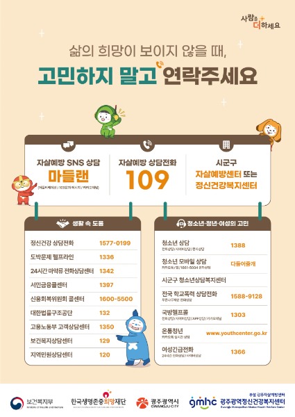 광주광역시(시장 강기정)는 정신건강 위기 상황에 놓인 시민이 언제든 도움받을 수 있도록 다양한 지원체계와 맞춤형 서비스를 마련해 적극 추진하고 있다.