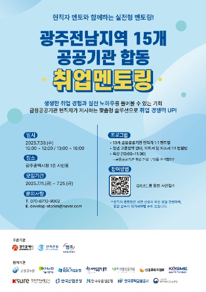 광주광역시(시장 강기정)는 지역 청년들의 금융공공기관 취업을 지원하기 위한 ‘광주전남지역 공공기관 합동 취업멘토링’ 행사를 30일 시청 1층 시민홀에서 개최한다.