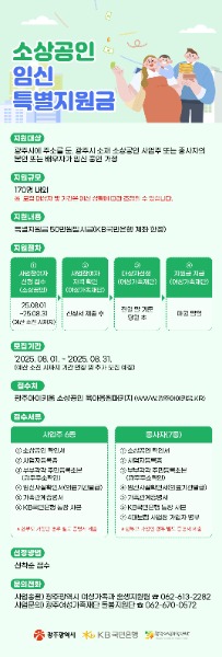 희망자 신청 접수는 1일부터 31일까지이다. 신청자가 많을 경우 조기 종료될 수 있다. 지원 대상은 광주시에 주민등록을 두고 있는 소상공인(사업주 또는 종사자) 가정 중 본인 또는 배우자가 신청일 현재 임신 중이거나 올해 1월부터 신청일 현재까지 출산한 가정이다.