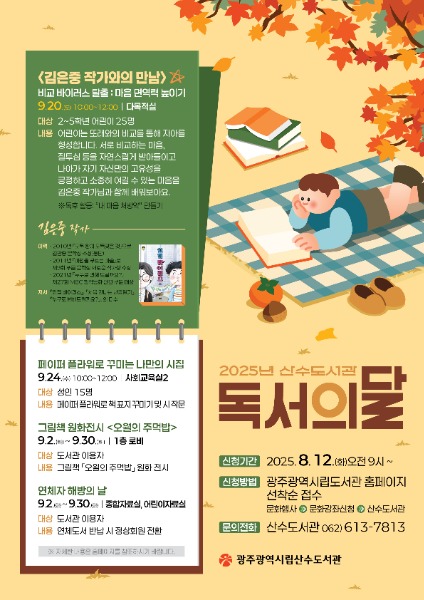 광주시립도서관(무등·사직·산수·디지털정보)은 9월 ‘독서의 달’을 맞아 시민과 함께하는 다양한 독서문화 행사를 진행한다.