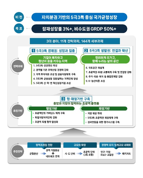 정부는 앞서 전국을 수도권, 충청권, 호남권, 대경권, 부울경 등 5개 초광역권(5극)과 강원, 전북, 제주 3개 특별자치도(3특) 중심으로 재편하는 국가균형발전 전략을 발표한 바 있다.
