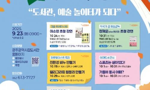 광주광역시립도서관(무등·사직·산수)은 ‘10월 문화의 달’을 맞아 가족들이 도서관에서 함께 즐길 수 있는 강연, 전시, 체험 프로그램 등 ‘도서관, 예술 놀이터가 되다’ 행사를 운영한다.