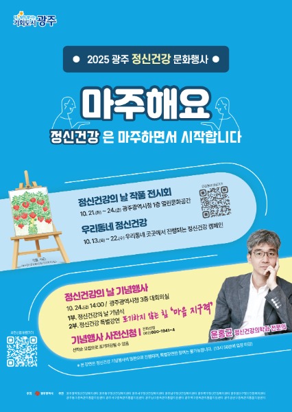 광주광역시(시장 강기정)는 ‘정신건강 홍보주간’(10월 10~24일)을 맞아 시민의 마음 건강 증진을 위한 다양한 문화행사를 연다.