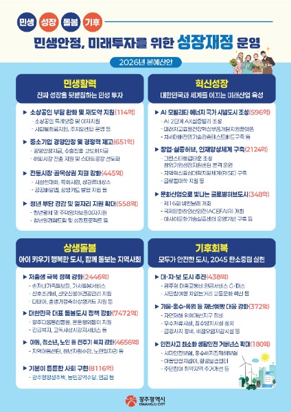 2026년도 예산안은 ‘민생‧성장·돌봄‧기후4대 전략, 함께 행복한 광주’를 실현하기 위한 방향으로 편성했다. 광주시는 특히 ▲민생활력 : 서민경제 안정과 골목상권 재도약 지원 ▲혁신성장 : 미래산업 선도와 글로벌 혁신도시 도약 ▲상생돌봄 : 인구위기 대응과 전 생애주기 복지 실현 ▲기후회복 : 2045 탄소중립과 안전한 도시 구현 등 4대 전략에 중점적으로 투자한다.