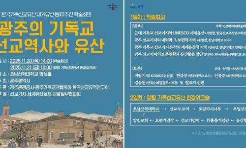 광주광역시(시장 강기정)는 20~21일 호남신학대학교 일원에서 ‘한국기독선교유산 세계유산 등재 추진을 위한 학술회의와 워크숍’을 열어 한국 근대 기독교 선교의 역사적 가치를 조명한다.