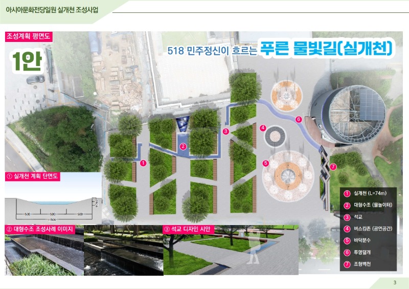 ‘아시아문화전당 실개천 조성’은 아시아문화전당 회화나무 공원 주변에 도심 물길을 조성해 아시아문화전당과 구도심 활성화를 도모하는 사업이다. 광주시는 2025년부터 2026년까지 총 30억원(국비 15억원·시비 15억원)을 투입해 사업을 추진한다.