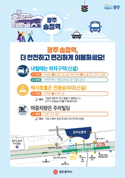 광주광역시(시장 강기정)는 호남의 관문인 광주송정역 일대의 상습 정체와 혼잡, 보행안전 문제를 해소하고, 이용객 편의를 높이기 위해 승강장 교통체계를 개편, 시범 운영에 들어갔다.