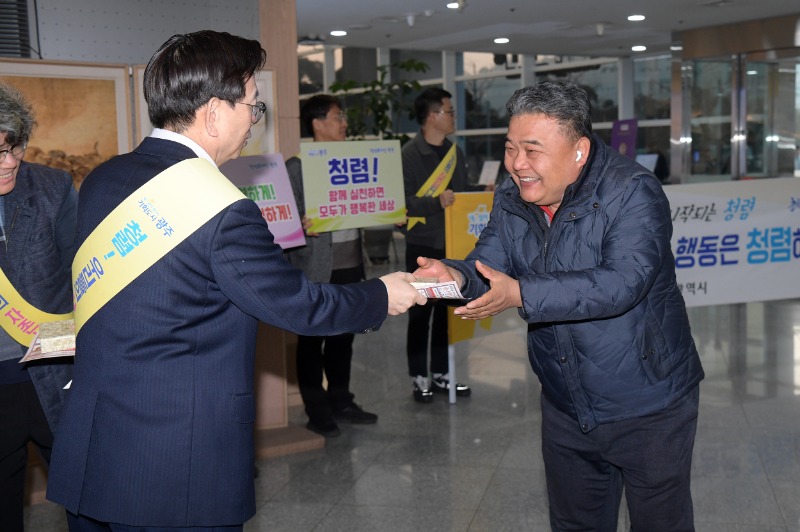 광주광역시(시장 강기정)는 12일 시청 1층에서 출근하는 직원들을 대상으로 ‘설 명절 청렴 캠페인’을 실시, 공직사회 전반에 청렴의 가치를 다시 한번 되새기는 시간을 가졌다.