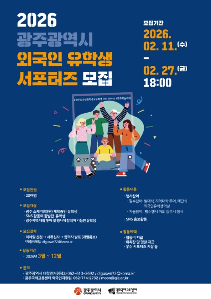 신청 자격은 광주지역 대학(원)에 재학 중이거나 입학이 확정된 외국인 유학생이다. 광주시는 SNS 활용 능력, 한국어 능력, 참여 의지 등을 종합적으로 판단해 성별·국적·재학 대학 균형을 고려해 3월 중 최종 인원을 발표할 예정이다.