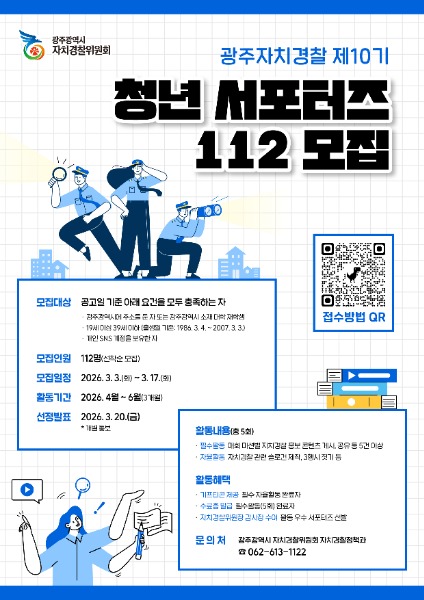 광주광역시 자치경찰위원회는 3일부터 17일까지 ‘제10기 청년 서포터즈 112’ 참여자 112명을 모집한다.