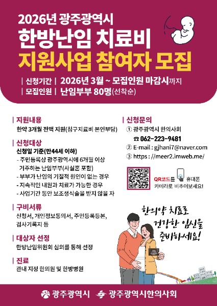 광주광역시(시장 강기정)는 난임 부부의 임신·출산을 돕고 치료에 따른 경제적 부담을 덜어주는 ‘2026년 한방 난임치료비 지원사업’을 시행한다.