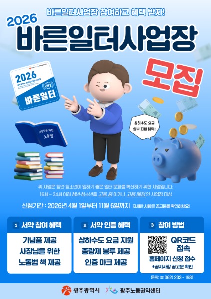 광주시는 청년과 청소년이 안심하고 일할 수 있는 노동환경 조성을 위해 ‘2026년 바른일터 사업장’을 모집한다.
