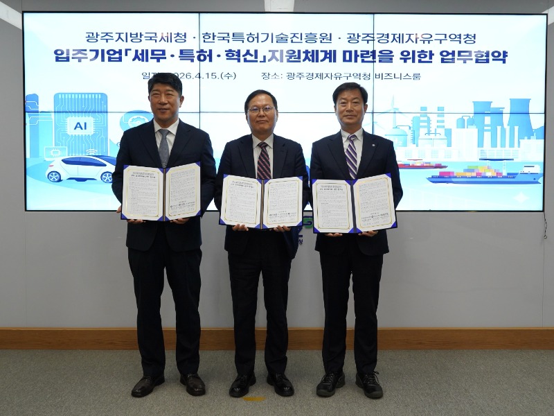 광주경제자유구역청은 15일 경자청 비즈니스룸에서 광주지방국세청, (재)한국특허기술진흥원과 ‘광주경제자유구역 핵심 전략산업 기업 육성 및 기술 경쟁력 강화를 위한 업무협약’을 체결했다.