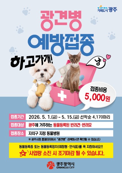 광주광역시(시장 강기정)는 반려동물과 시민의 건강을 지키기 위해 5월 1일부터 15일까지 ‘봄철 광견병 예방접종 사업’을 추진한다.