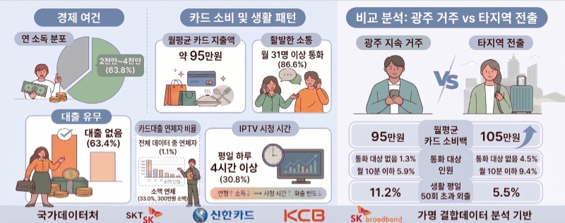 광주 거주 1인 가구와 타지역 전출 가구를 비교 분석한 결과도 눈에 띄었다. 타지역 전출 가구는 광주 거주 가구보다 고소득 비율(연 소득 4000만원 초과)과 카드 소비액(평균 105만 원)이 높았으나, 통화 대상이 없거나 외출 빈도가 낮은 등 사회적 고립 가능성은 오히려 더 높게 나타났다.